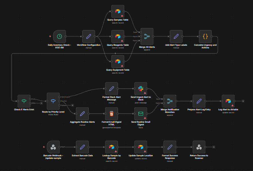 I designed the overall workflow architecture, defining the inventory data model across Samples, Reagents, and Equipment in Airtable and mapping alert conditions to formula filters. I implemented the scheduled inventory checks, data merging, and custom alert classification logic in n8n, including the JavaScript that computes time-to-expiry and maintenance windows. I configured branching logic to differentiate urgent from non-urgent events and wired Slack and email nodes for real-time alerts and daily digests. I built the barcode scan webhook flow that updates sample locations in Airtable and returns human-readable confirmations to bench scientists.